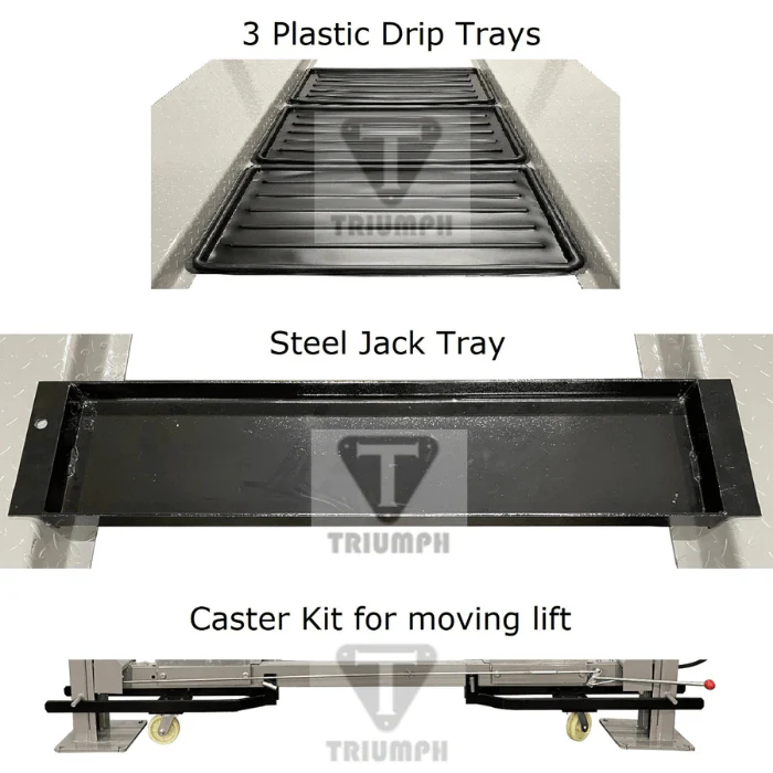 Triumph packed this model with must-have extras: a caster kit for mobility, a jack tray for extra versatility, and drip trays that keep your lower vehicle clean and dry. With ten automatic locking positions and a 110V power supply, this 4 post auto lift is both secure and plug-and-play ready. It's time to turn your garage into a pro-level workspaceβwithout breaking the bank or bolting anything down permanently. *The concrete must be at least 4" thick and have a minimum strength of 3000 PSI. Installing this lift on inadequate concrete may lead to serious injury or death. It is the customer's responsibility to confirm the concrete's thickness and strength before purchasing and installing the lift.