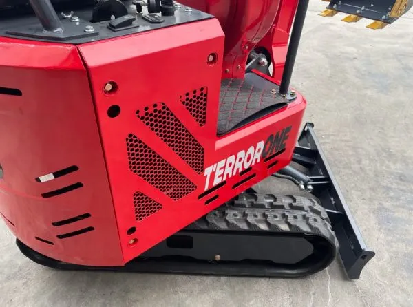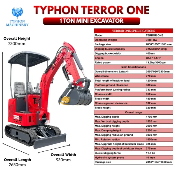 Introducing the TYPHON TERROR ONE STORM Mini Excavator β a 1-ton trench digger equipped with a canopy and a hydraulic thumb clip, designed for small construction projects. This compact powerhouse is engineered for easy maneuverability and superior performance in various settings, including farms, gardens, public spaces, parks, orchards, and more.