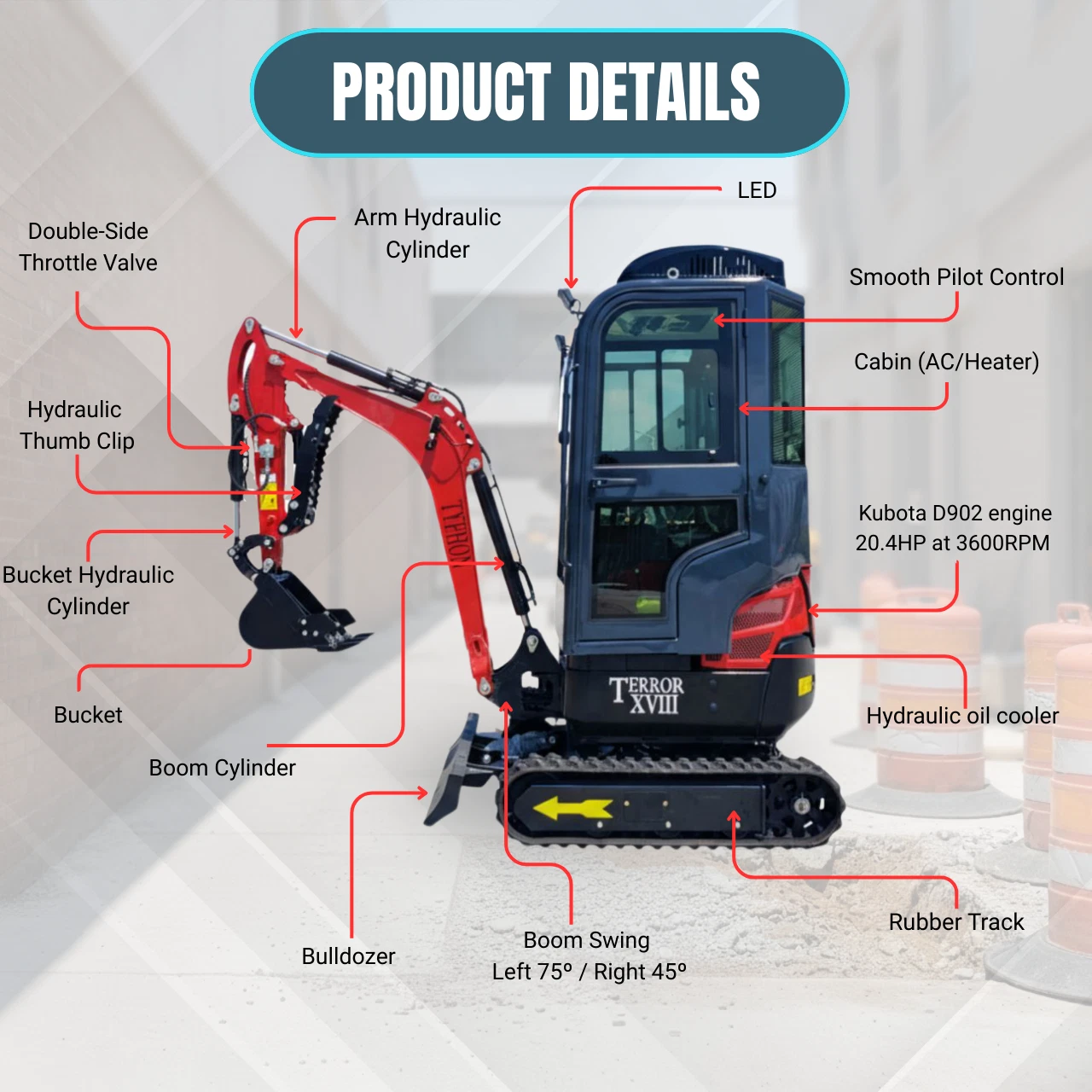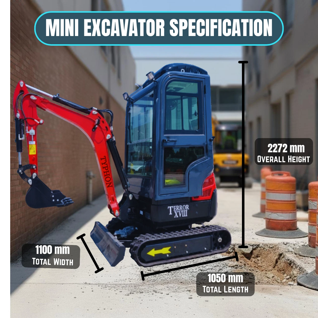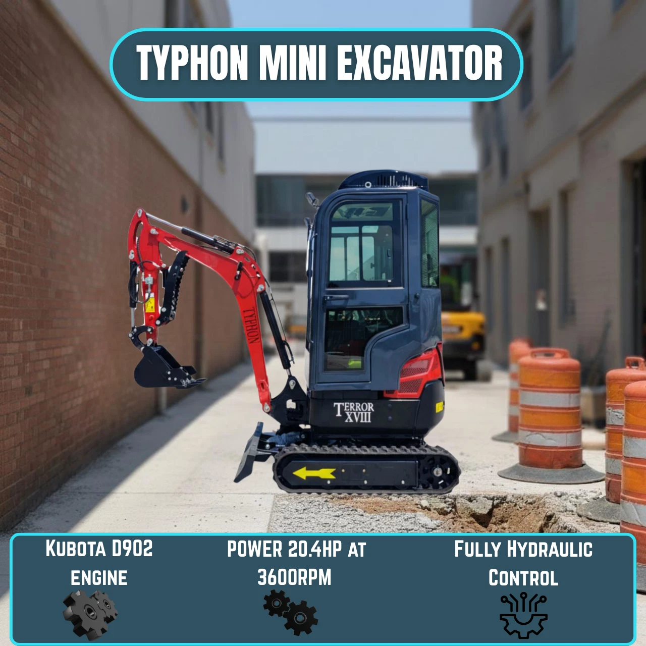 Most mini excavators force you to choose between power and precision β or between size and versatility. The TYPHON TERROR XVIII Prestige gives you all of it. At just 1,100 mm wide, it fits where full-size machines can't. With a Kubota D902 diesel engine, enclosed AC cabin, and 13 interchangeable attachments, it outperforms machines twice its size.