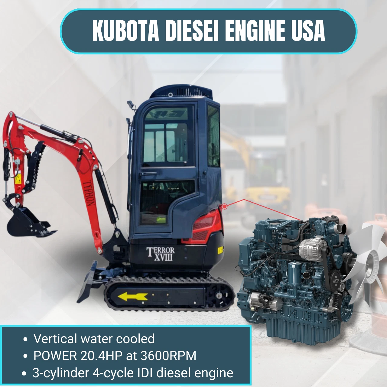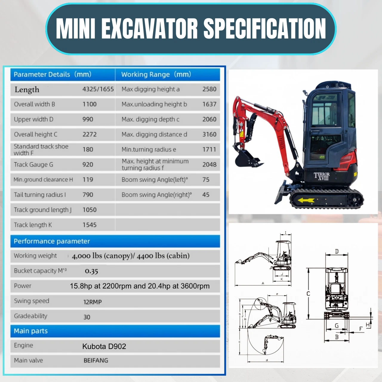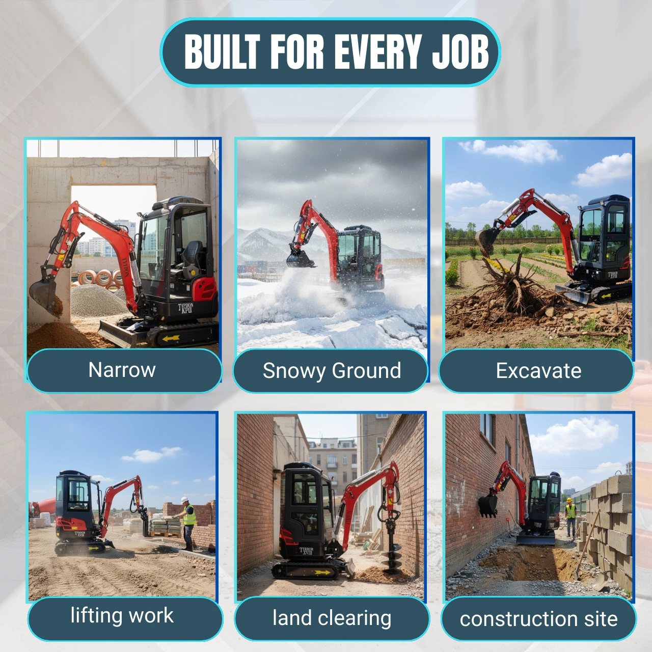 Most mini excavators force you to choose between power and precision β or between size and versatility. The TYPHON TERROR XVIII Prestige gives you all of it. At just 1,100 mm wide, it fits where full-size machines can't. With a Kubota D902 diesel engine, enclosed AC cabin, and 13 interchangeable attachments, it outperforms machines twice its size.