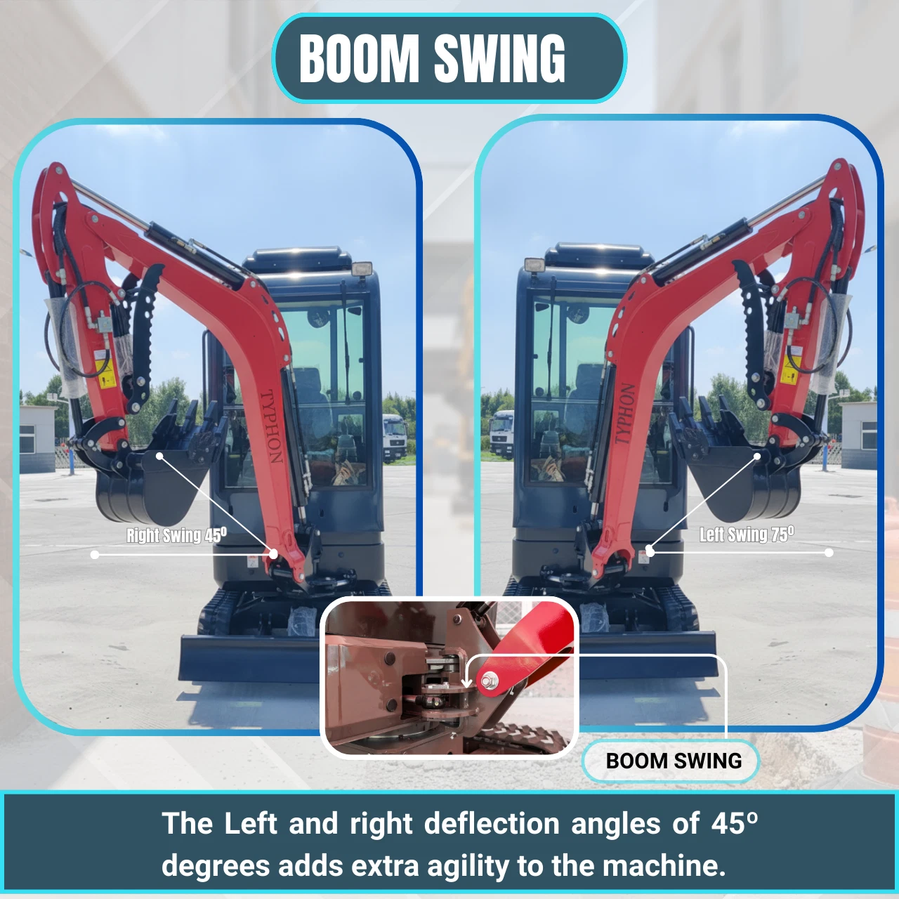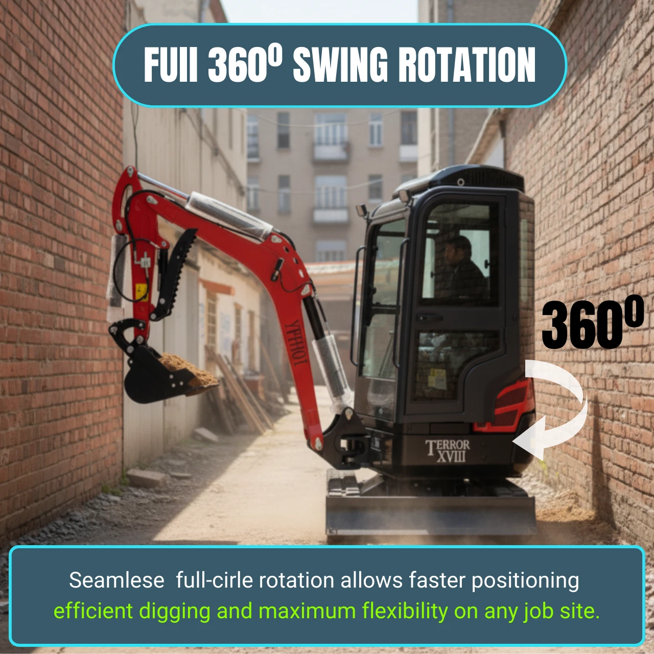 With an overall width of just 1,100 mm and zero tail swing, the TERROR XVIII Prestige moves freely through narrow gates, fenced yards, and confined job sites β without hitting walls or structures. A 75Β° left / 45Β° right boom swing gives you full reach in restricted areas where other machines simply can't operate.